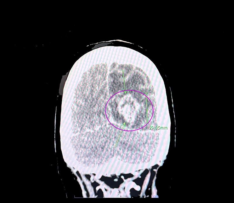 เราก็ได้แต่หันไปทำหน้างง ๆ ใส่แล้วเดินกลับเตียงไป ไม่เข้าใจว่าเขาหมายถึงอะไรกัน จนกระทั่งเมื่อมาเห็นไฟล์ภาพ CT Scan นั่นแหละถึงรู้ว่าเนื้องอกขนาดประมาณ 3×3 เซนติเมตรอยู่ในหัวด้านหลัง เหนือท้ายทอยเล็กน้อย มันเบียดแน่นไปหมด ดูพร้อมจะระเบิดได้ทุกเมื่อเขียวละ