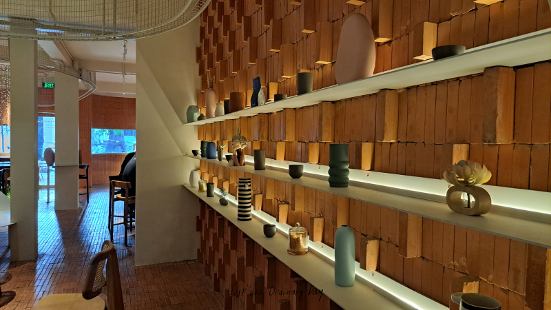 ส่วนที่เราชอบมากที่สุดใน Anh Cafe Roastery ก็คือผนังฝั่งนี้ที่จัดวางแจกันไว้เหมือนเป็นโซนแสดงศิลปะ มันสวยและลงตัวมาก แต่ว่าคนซุ่มซ่ามอย่างเราก็พยายามยืนห่าง ๆ อะนะ กลัวทำของเขาตกแตกแล้วจะไม่มีปัญญาชดใช้ ยกแผงเลยดิฉันก็ไม่ไหวนะ