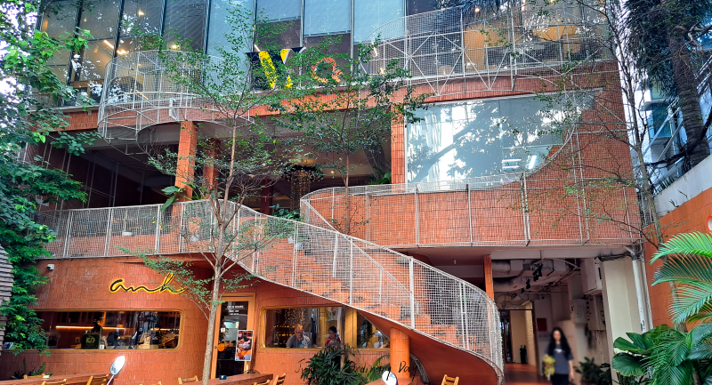 Anh Cafe Roastery โดดเด่นเป็นสง่า ตึกสามชั้นสร้างอิฐสีแดงส้ม รูปทรงร่วมสมัย เห็นแวบเดียวก็รู้ว่าถึงที่หมายแล้ว ด้านนอกบรรยากาศสบาย ๆ อบอุ่นไม่วุ่นวาย แต่ยังให้ความรู้สึกหรูหราไปในตัว