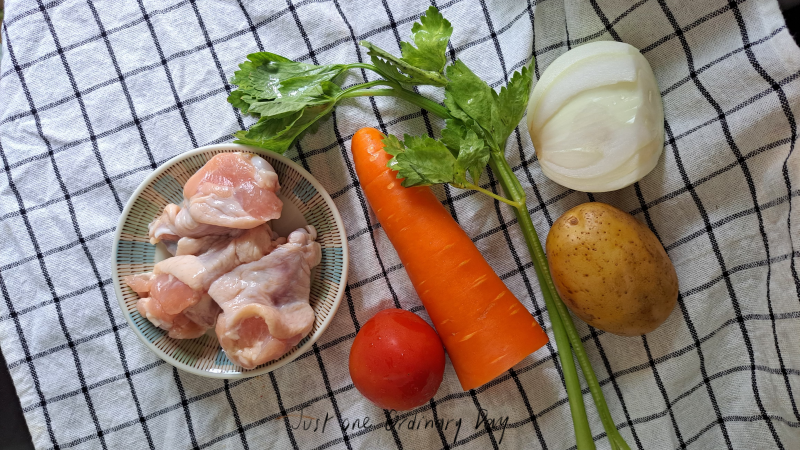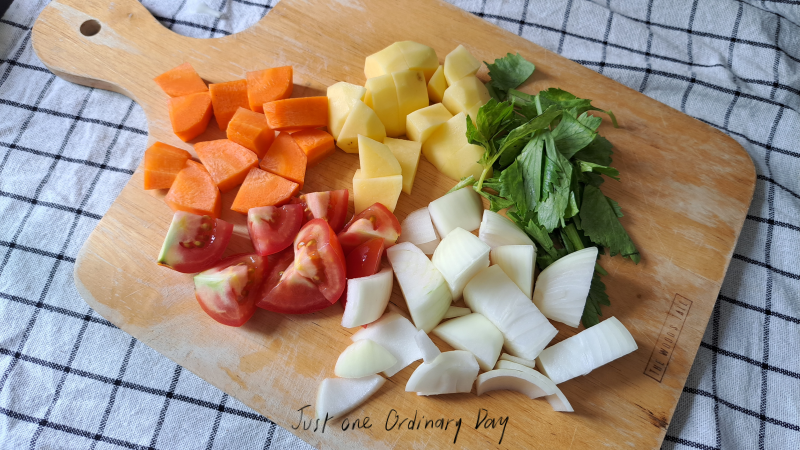 ปอกเปลือกมั่นฝรั่งและแครอตแล้วหั่นเป็นชิ้นใหญ่ ส่วนหัวหอมใหญ่และมะเขือเทศหั่นเป็นชิ้นตามแนวตั้งและแนวนอน