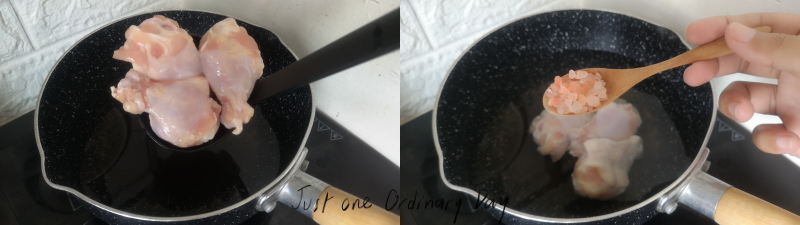 ตั้งน้ำด้วยไฟกลาง ใส่ไก่และเกลือ