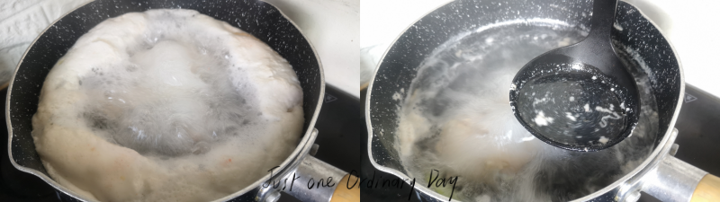 เมื่อน้ำเดือดมาก ๆ ให้ตักฟองสีน้ำตาลออกจนน้ำใสแจ๋ว