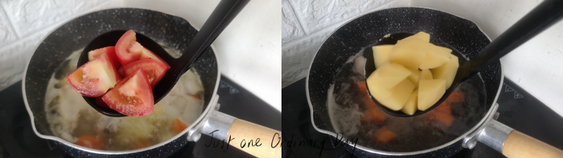 ใส่มะเขือเทศและมันฝรั่งลงไป